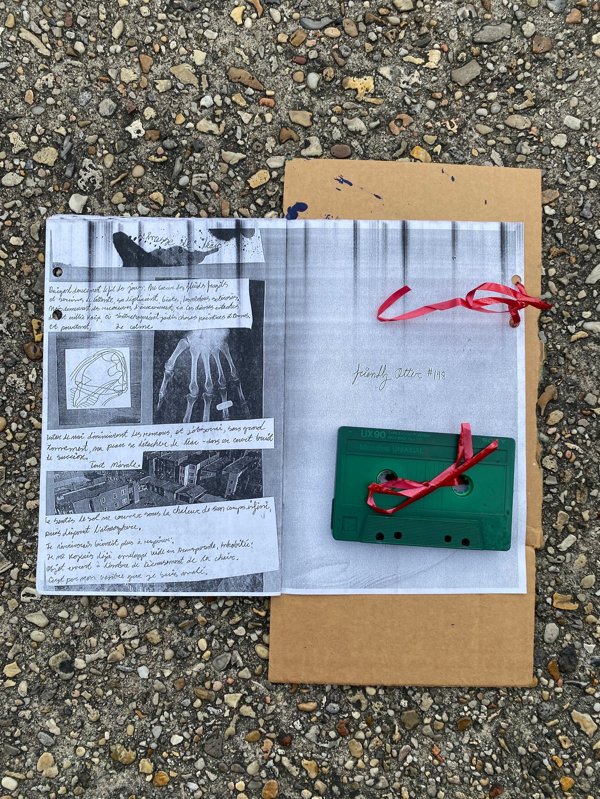 This collection tape has been a very special piece to create. This band has been absolutely crushing it in the Quebec screamo scene for years. For this, the band allowed me to write out all of their lyrics across a zine. All lyrics are handwritten and scanned with the help of DJ Speedsick. Each tape was dubbed in real time and is hand painted and stamped. Each cover has been hand painted and is unique. The zine and tape are both bound to the cover using ribbon. 15 copies were made.