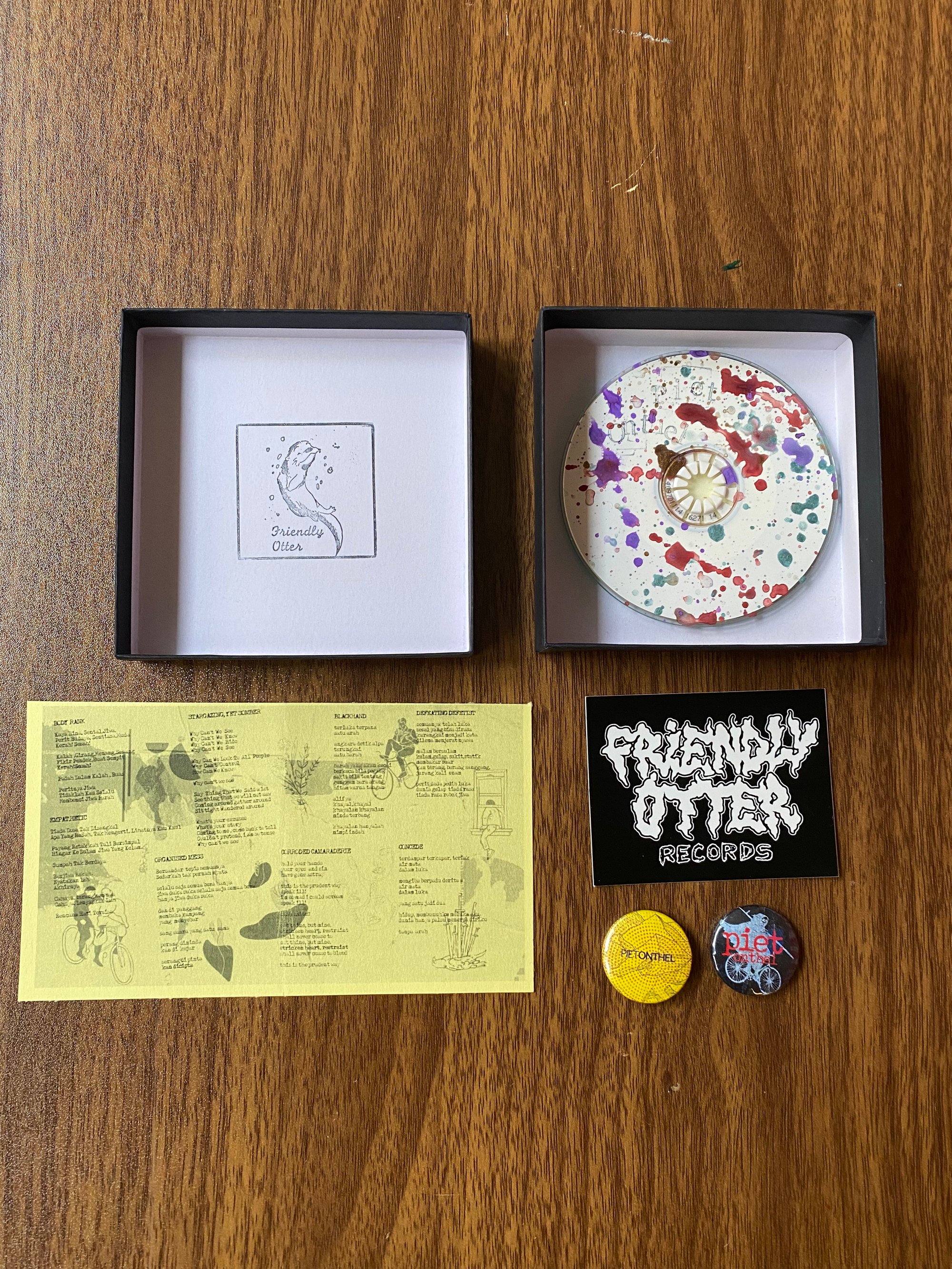 Our copies are on 3" cdrs housed in a black jewel case. The cd's are painted and stamped. The box has the covers pasted on, with a Friendly Otter logo stamped inside. There is a lyric insert, FO sticker, and exclusive Piet Onthel buttons designed by the band and made by myself.